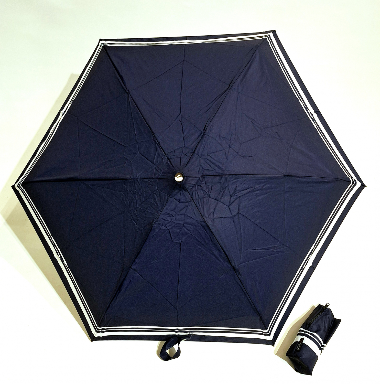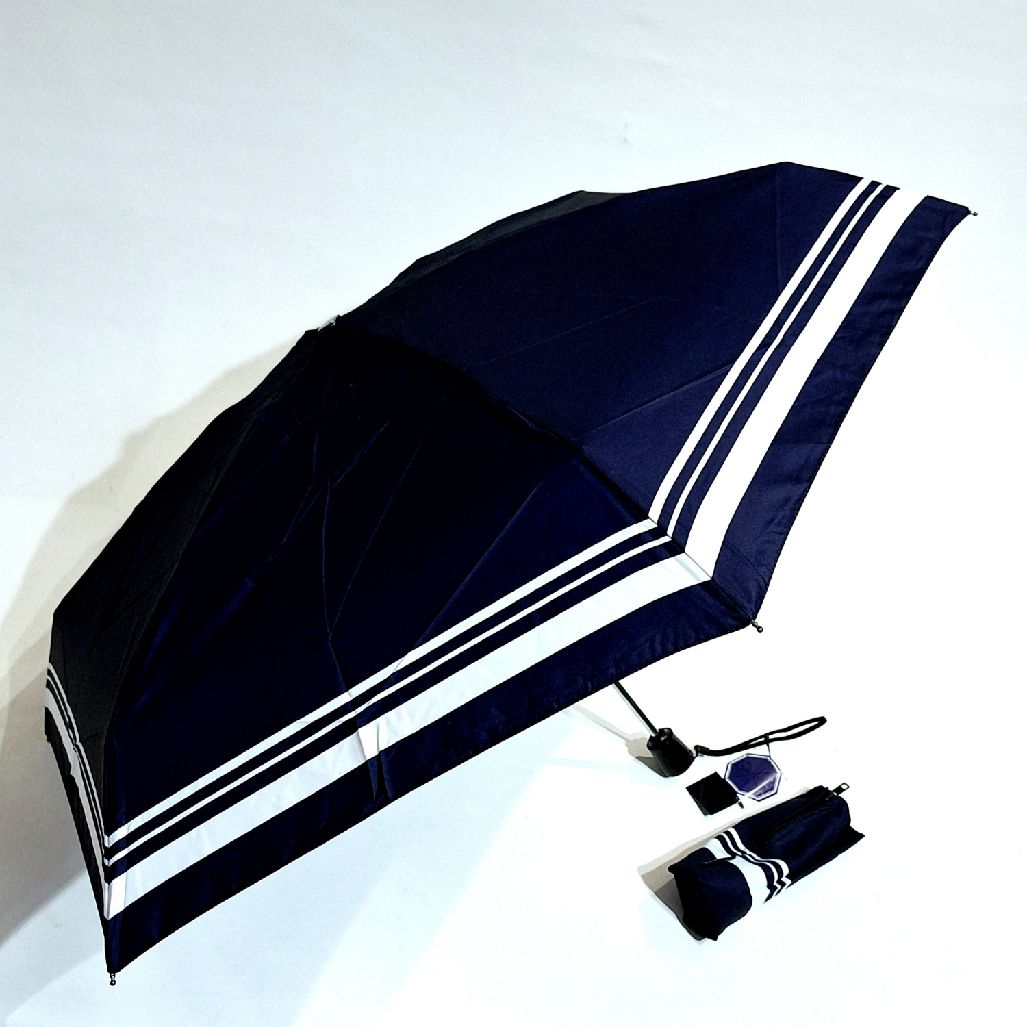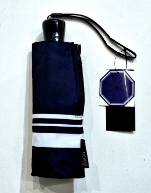 Parapluie mini automatique ouvré fermé Bleu marine & bordé en blanc Le Classique Chic Neyrat Autun - léger & solide