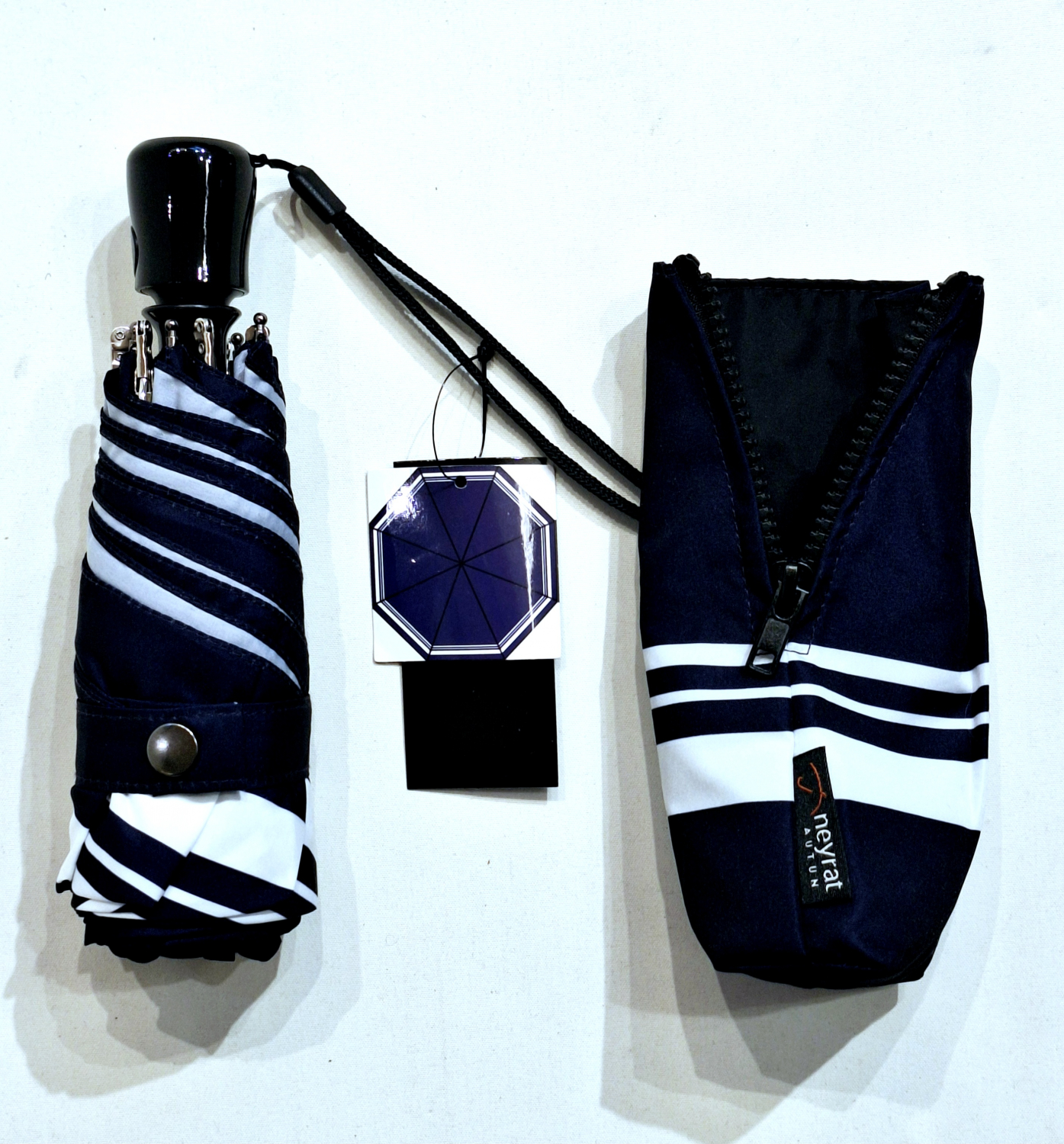 Fabrication Française par la Société Neyrat Autun, une ligne de micro parapluie pliant très accessible par le prix tout en préservant le savoir faire, nous offre un réel plaisir d'efficacité et de confort. Parapluie pliant mini pratique idéal au quotidien, facile à ouvrir et à fermer (ouvré fermé), solide, confortable et léger. Parapluie pliant automatique un intemporel sur un fond bleu marine et blanc = Le Classique élégant. Il a une résistance forte pour le vent, mais pas au delà de 70km/h. Bref, c'est avant tout un parapluie égoiste uniquement pour vous et un Bon, Rapport, Qualité, Prix.