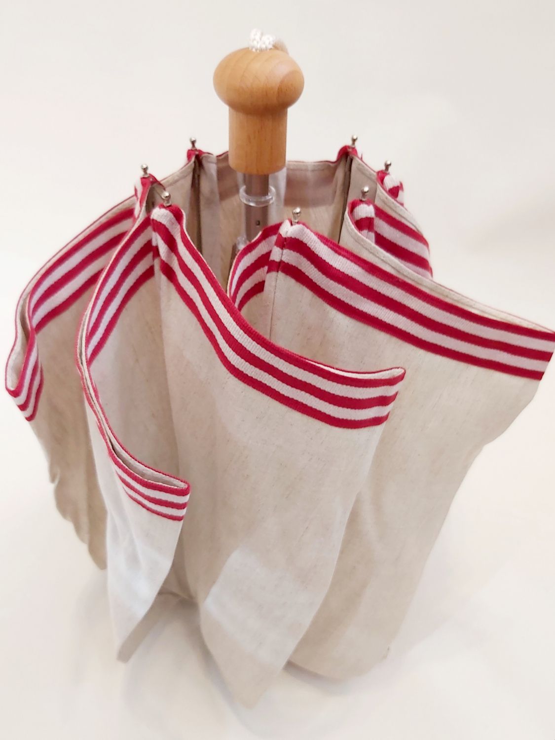 Ombrelle anti uv à 98% fait main pliable en lin naturel bordé galon rayé rouge - légère & française
