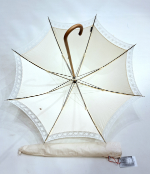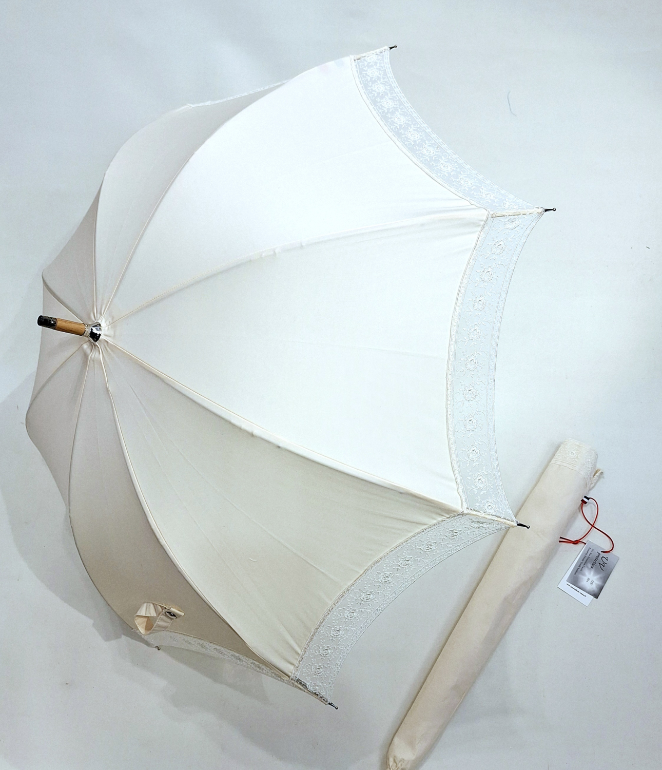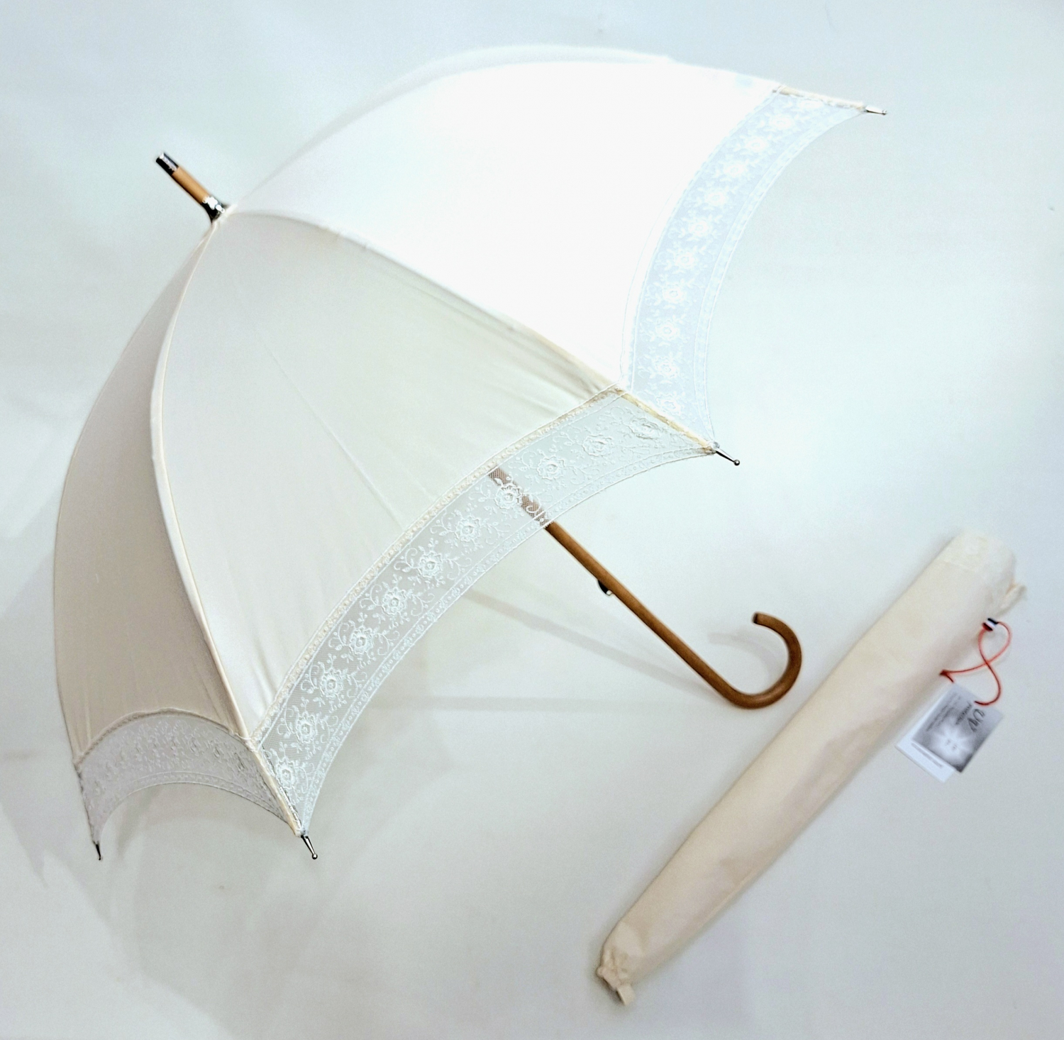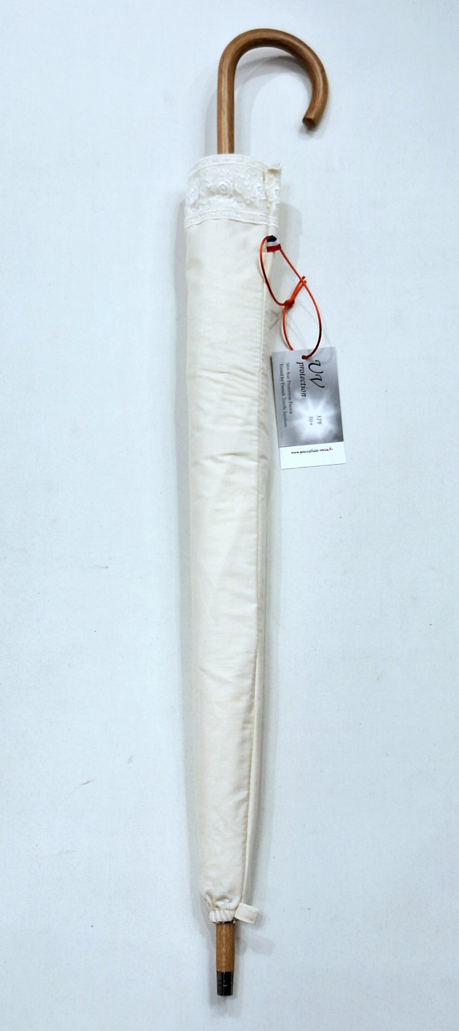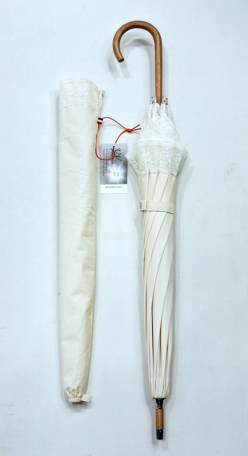 Ombrelle dentelle anti uv à 100% montage anglais chêne - Coton ivoire bordé de dentelle blanche - légère & française