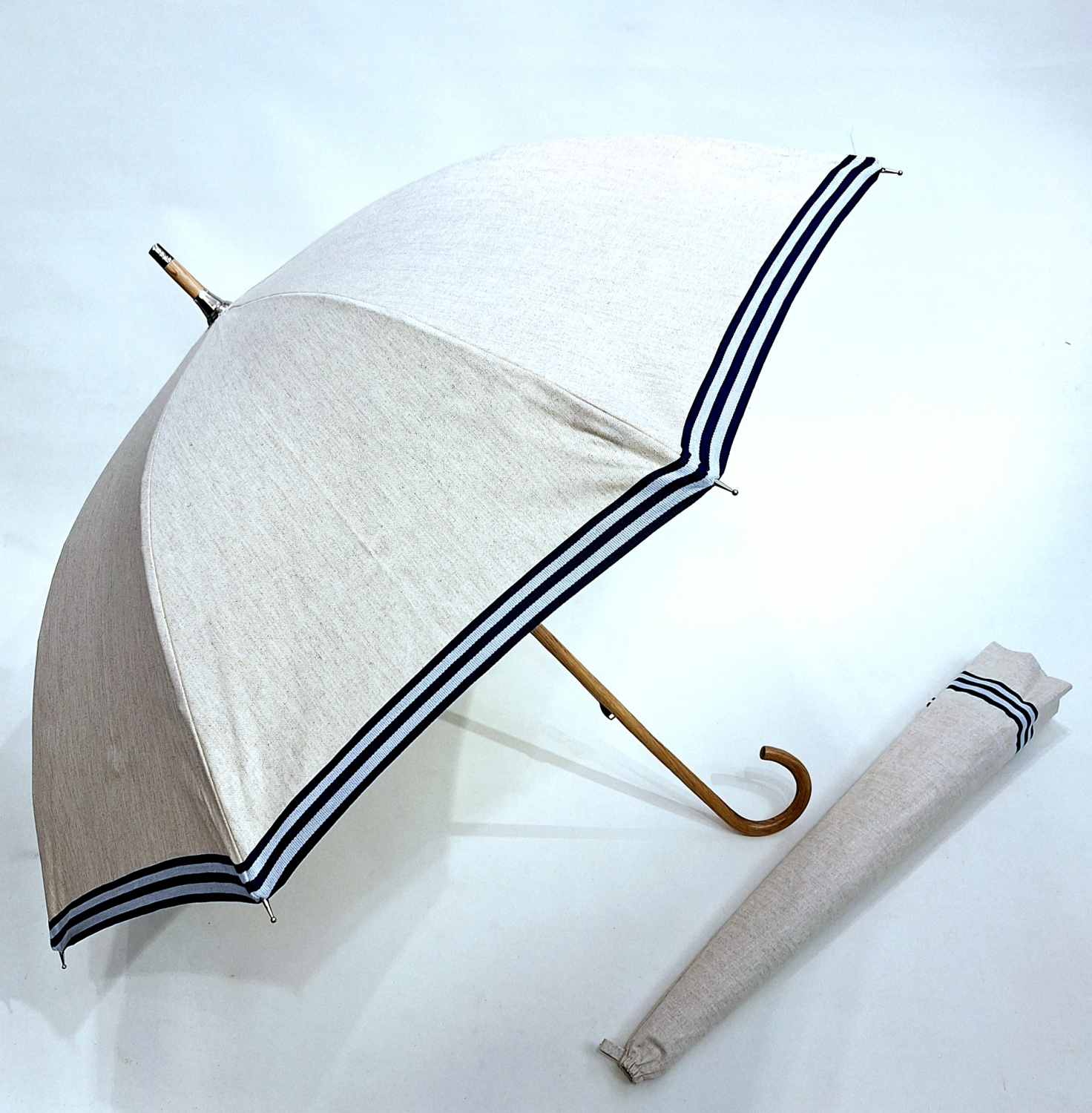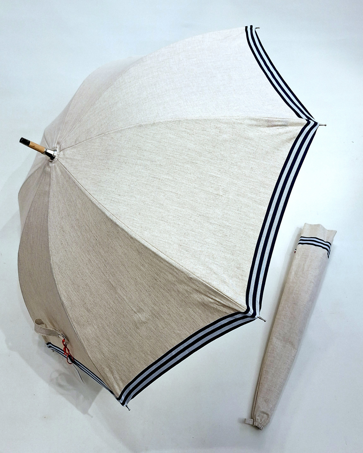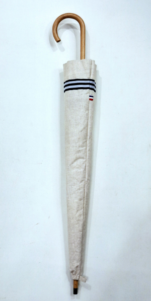Ombrelle anti uv en lin bordée galon marinière Marine montage anglais en chêne - blocage des rayons à 100%