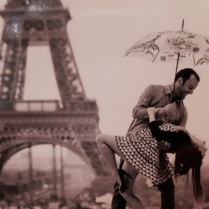 Dessin la parisienne dans un jardin entourée d'immeuble Hausmanien et au fond la dame de fer.