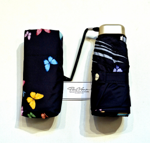 Tissu 100% polyester fond noir imprimé de papillons colorés. Poignée rectangulaire en alu. 7 baleines en acier & renforcées en fibre de carbone.