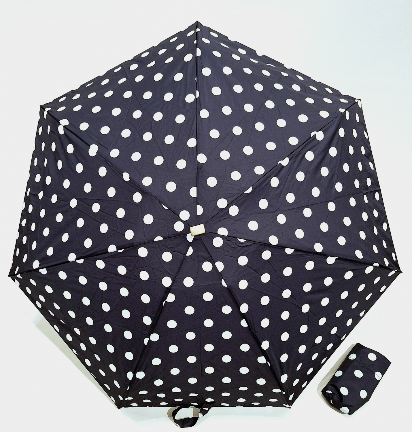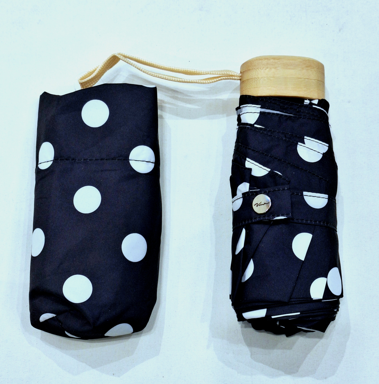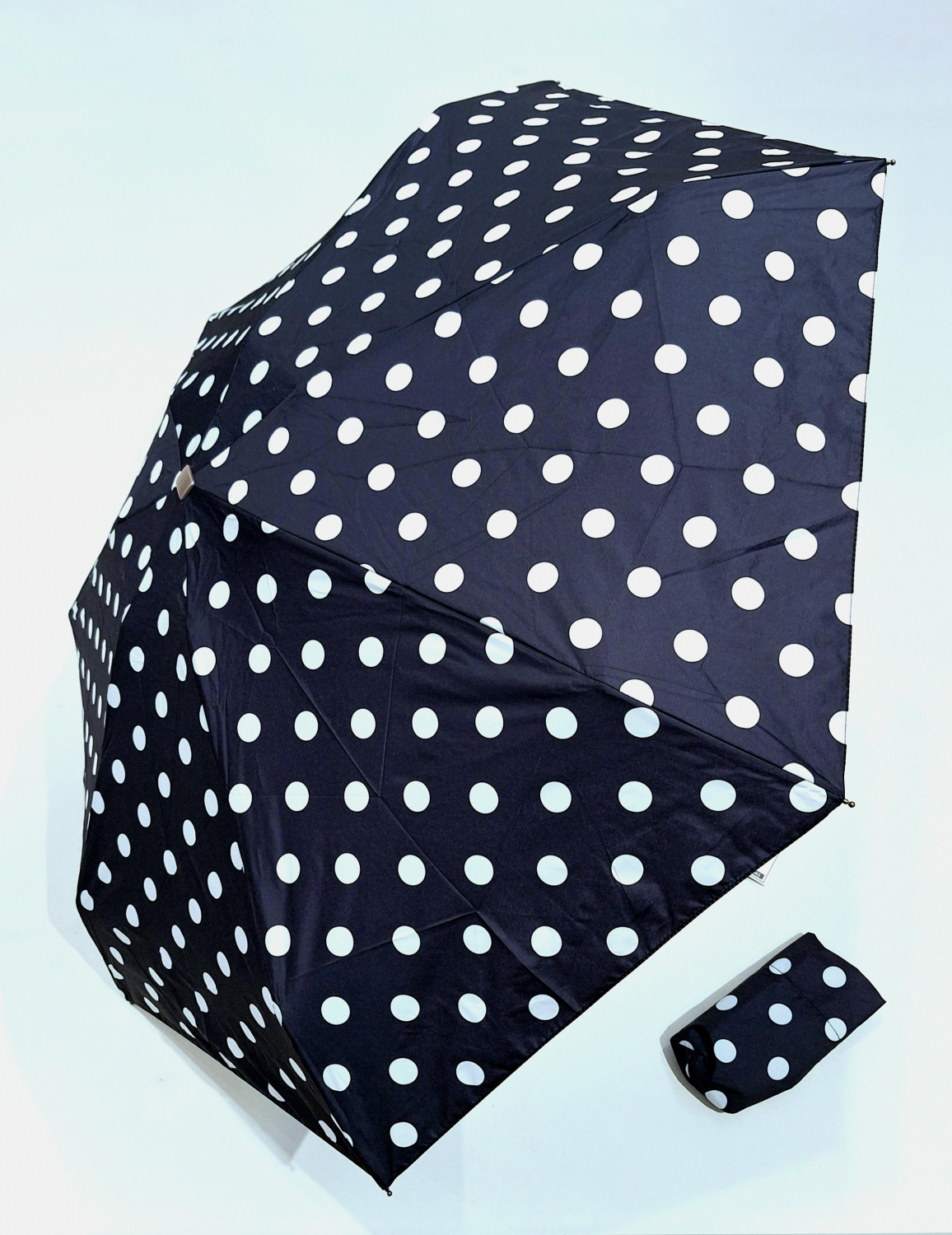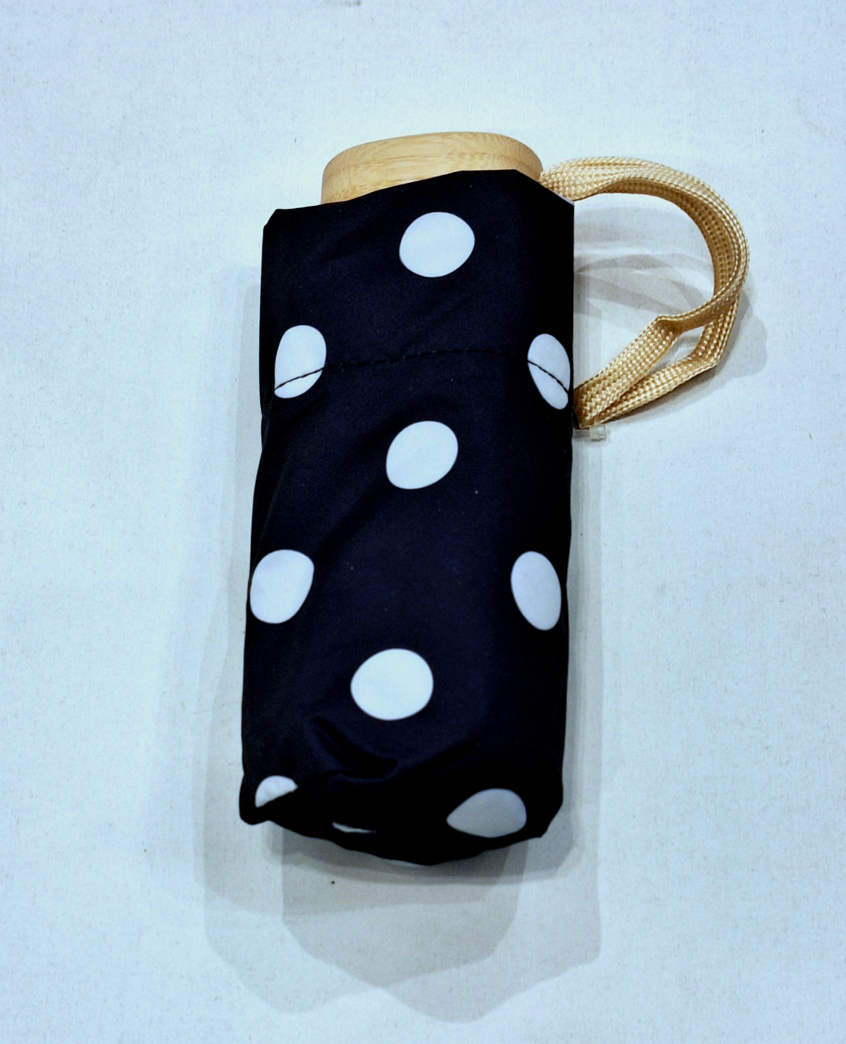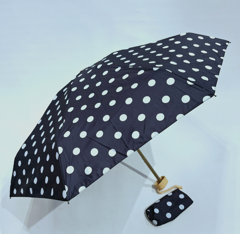 Parapluie de poche plat noir imprimé pois blanc - Poignée bois - Français Vaux - léger & résistant