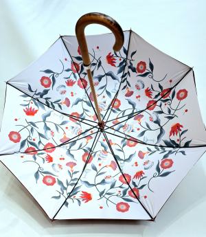 Tissus 100% polyester recyclé doublé coloris rose et imprimé à l'intérieur sur fond blanc de fleurs. Protection solaire anti uv 100% UPF50+ - Le blocage des rayons. 8 branches en acier épais. Mât en bois avec une ouverture manuelle. Poignée courbe bois en hêtre. Fermoir avec une pression.