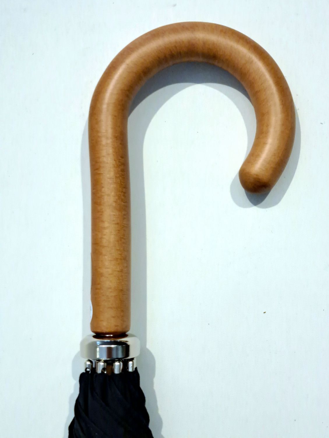 Tissu en coton plus fin et de coloris en uni noir. Protection anti uv et blocage des rayons UPF50+ à 98%. Poignée courbe bois naturel en hêtre avec un godet nickelée.