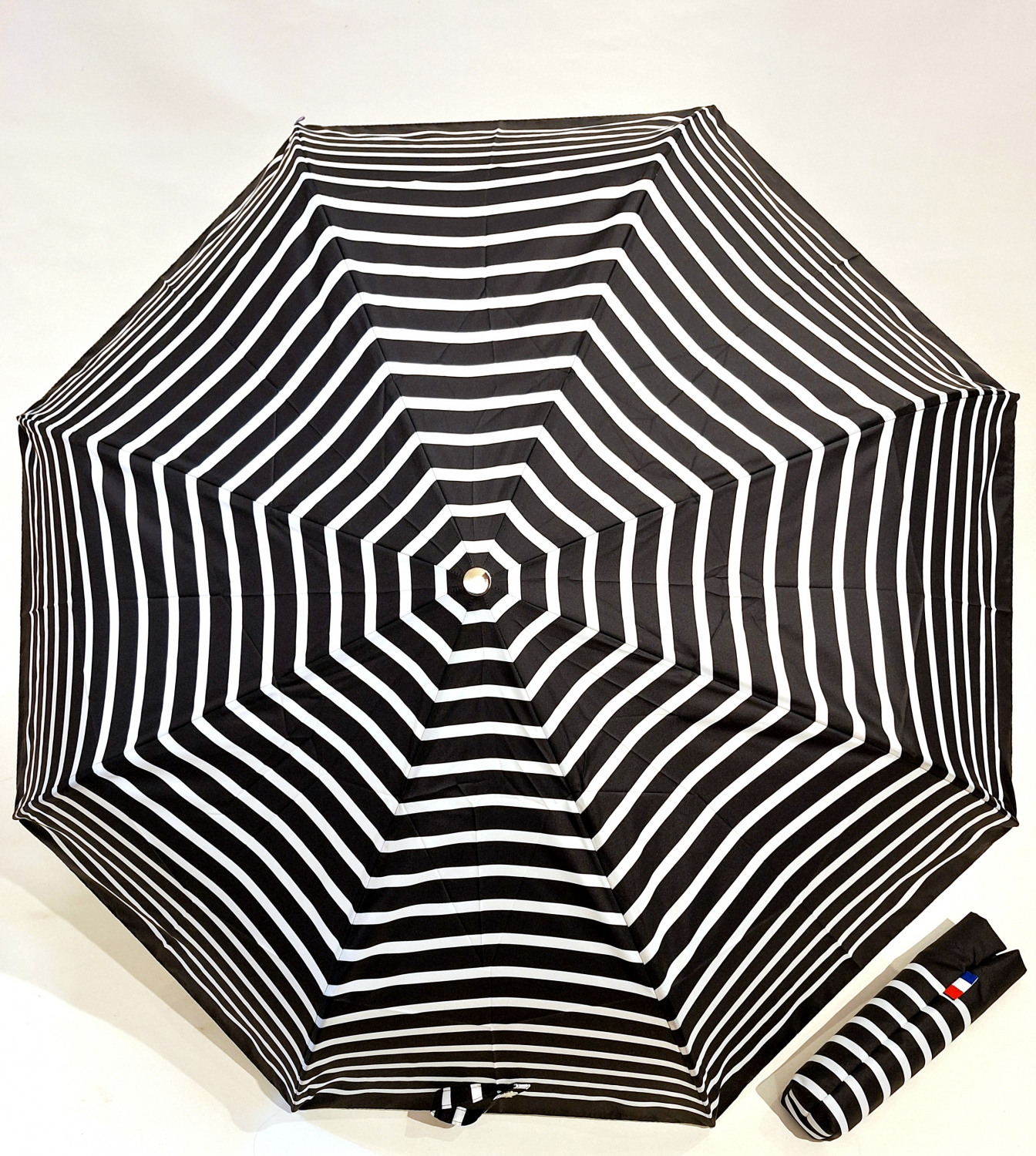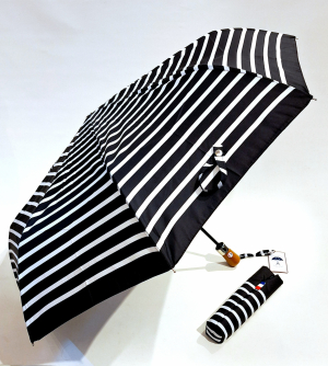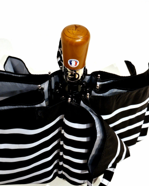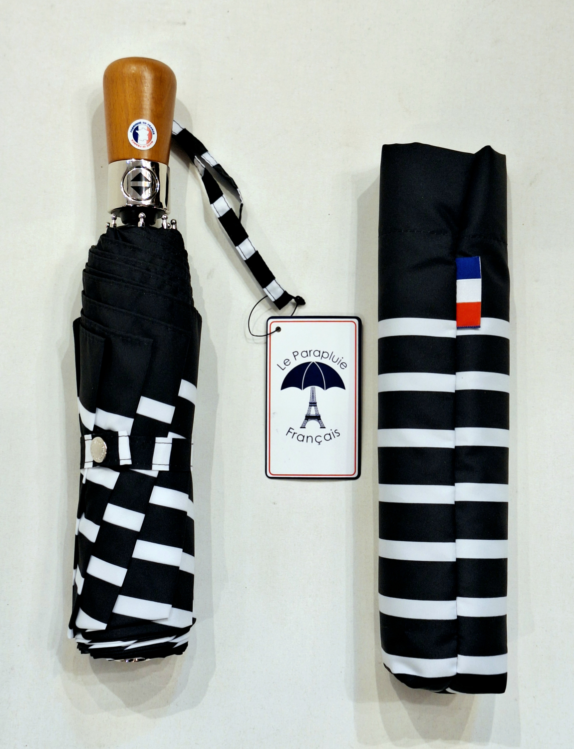 Parapluie français mini pliant noir & blanc à rayure automatique poignée bois - Grand & résistant