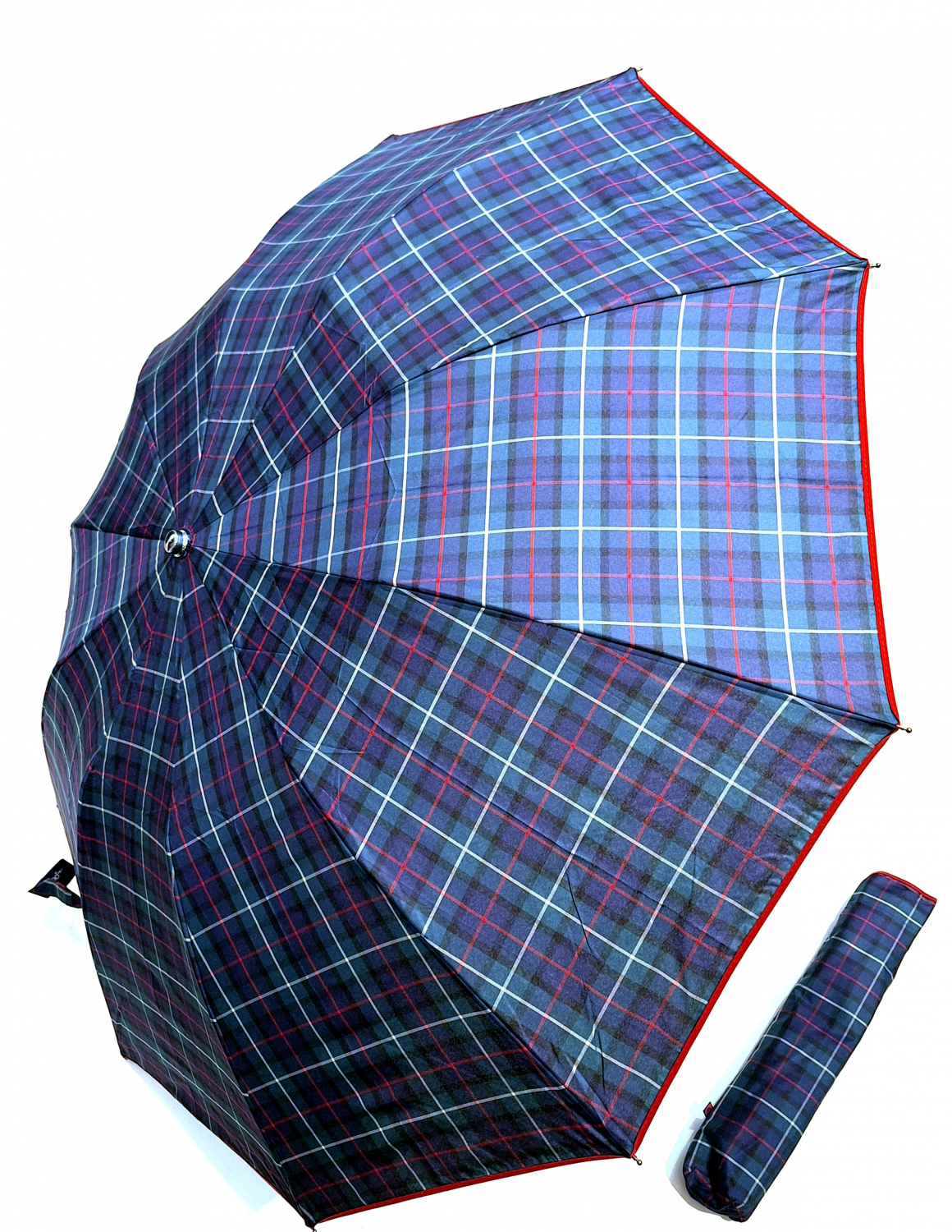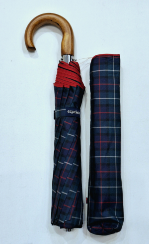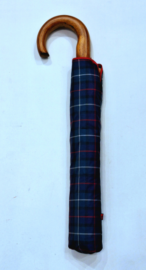 Parapluie pliant automatique bleu/vert ecossais poignée courbe bois foncé -10 branches robuste