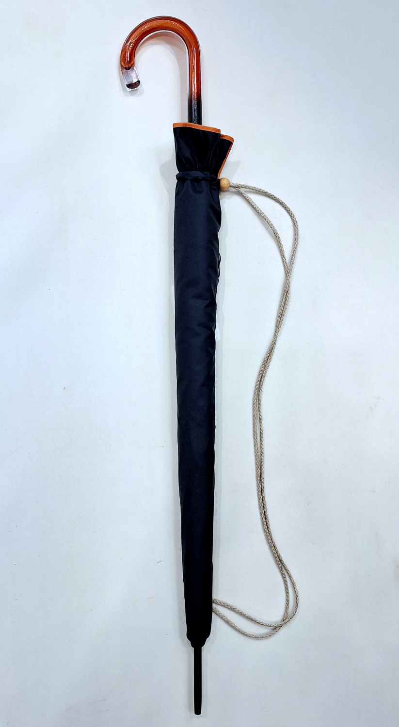 Parapluie grand Bandoulière Piganiol manuel uni bleu marine & biais ocre HACIENDA français - Classique chic & résistant
